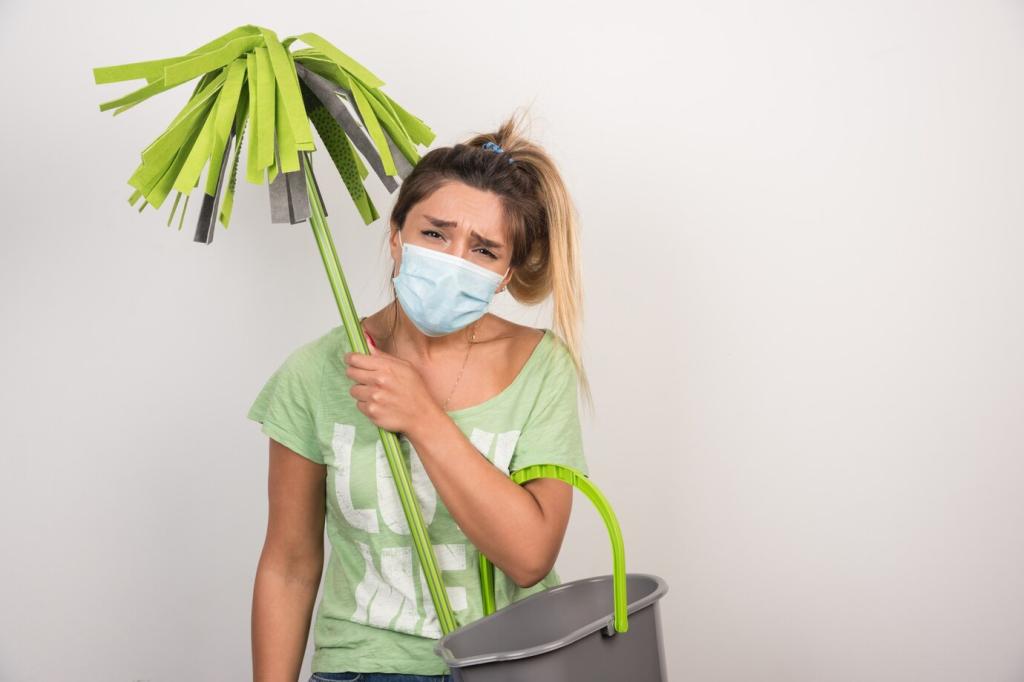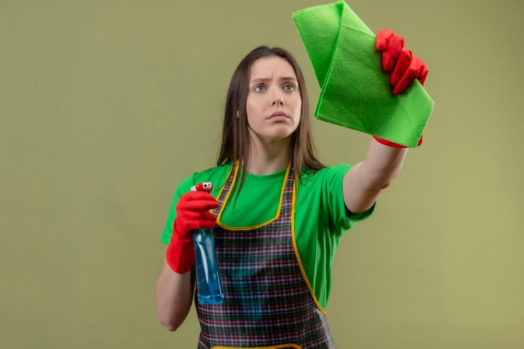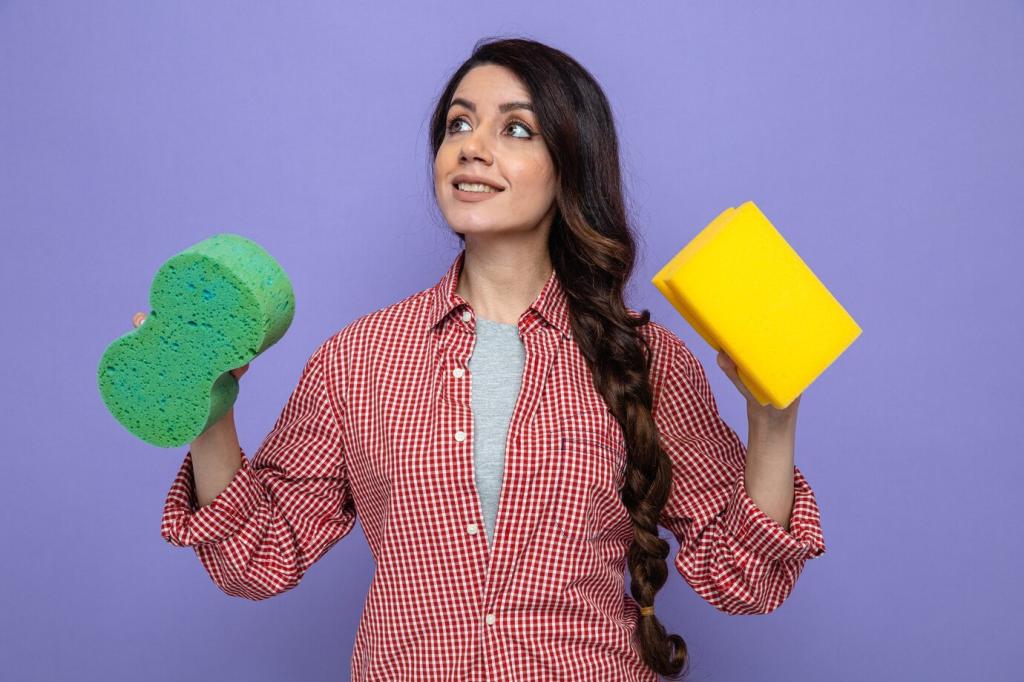 Wische entlang der Maserung mit leicht angefeuchtetem Tuch und milder Holzseife. Nässe vermeiden, anschließend trocken polieren. Bei stumpfen Zonen punktuell nachölen, überschüssiges Öl abnehmen. So bleibt die Oberfläche atmungsaktiv. Hast du eine Flohmarkt-Erinnerung, die du mit sanfter Pflege gerettet hast? Teile die Geschichte!